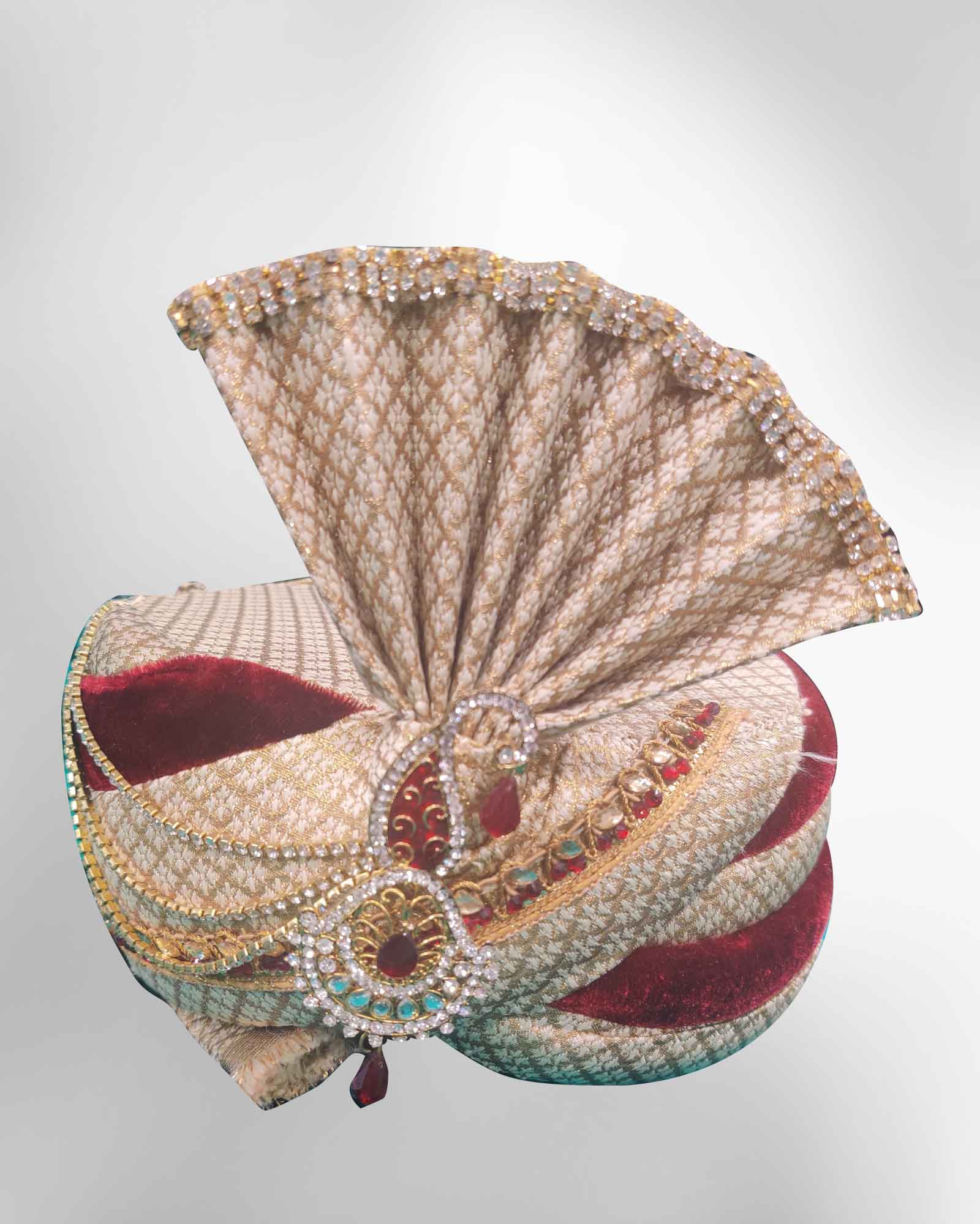 Brocade beige and maroon turban for groom wedding. Enhance zari weaving at over all with brooch.